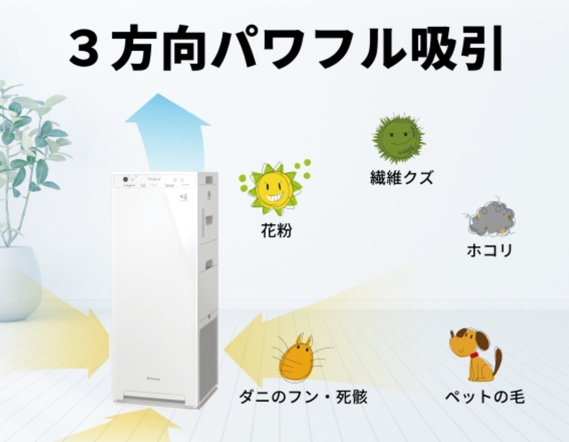 3方向のパワフル吸引でハウスダストもしっかり集塵・さらにフィルターに捕らえたダニのフン・死骸も抑制。
