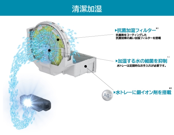 ※(水トレーの菌抑制) 試験機関:(一財)日本食品分析センター 試験対象:加湿用水内の1種類の細菌。試験結果:約24時間で99%以上抑制。