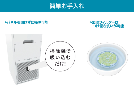加湿フィルターは抗菌剤をコーティングした、抗菌効果の高い仕様。さらに加湿する水の細菌も抑制するので安心してご使用いただけます。加湿フィルターは簡単取り外しでつけ置き洗いも可能。フィルターもパネルを外さずに掃除機で吸い込むだけ。