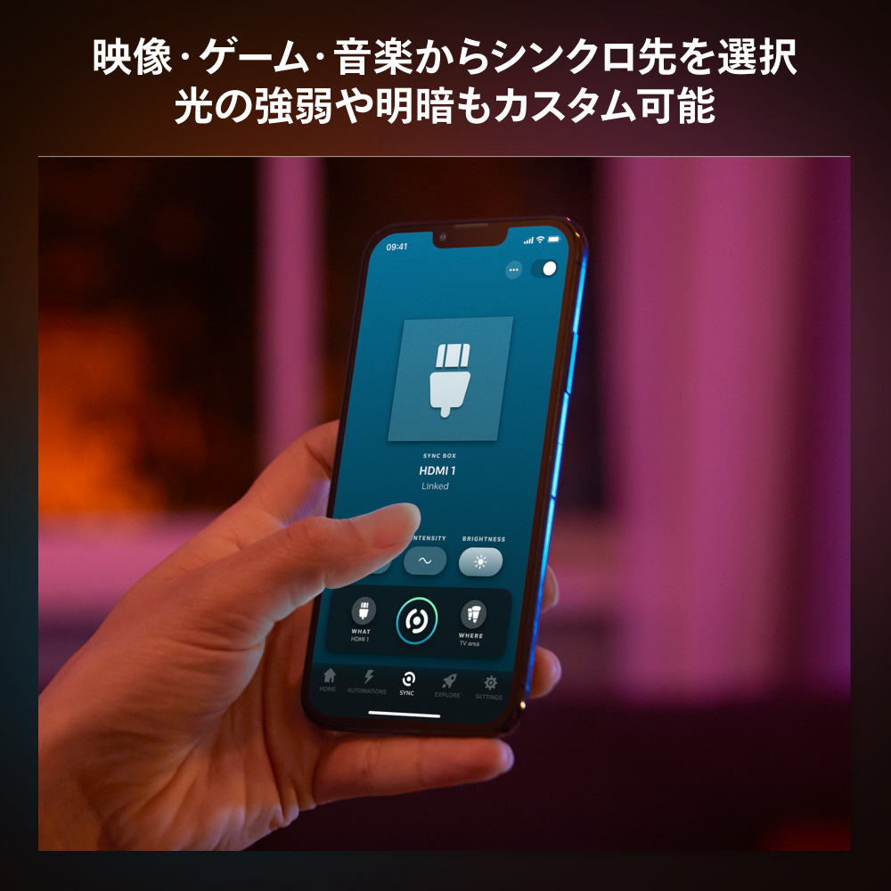 Hue アプリで、色や明るさ、映像・音楽・ゲームに合わせたシンクロ強度などを自由にカスタマイズでき、自分だけのオリジナル演出を創り出すことができます。