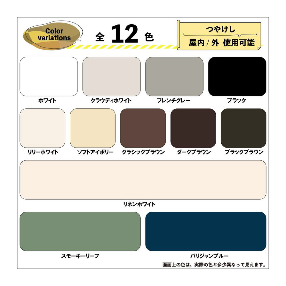 ・※表記の用途以外には使用しないでください。 木部・木製品 家具 / インテリアグッズ / 板べい / ドア / ガーデニング用品 等 鉄部・鉄製品 門扉 / フェンス / 物置 / 鉄骨 / 鉄柱 / 電気・機械 器具 /農機具 等 プラスチック系 発泡スチロール / プラスチック(硬質塩ビ、アクリル、ABS)等 ※ポリエチレン、ポリプロピレ ンなどは除く 屋内壁・各種ボード 室内壁(リビング・キッチン・寝室・子供部屋など)/ ビニールクロス / モルタル壁 / 板壁 / 石膏ボード・ケイカル板 等 ※ポリエチレン、ポリプロピレン、壁紙などは除く 屋外壁・塀 コンクリート・モルタル面の外壁 / サイディング面(セラミック系は除く)/ ブロック塀 等