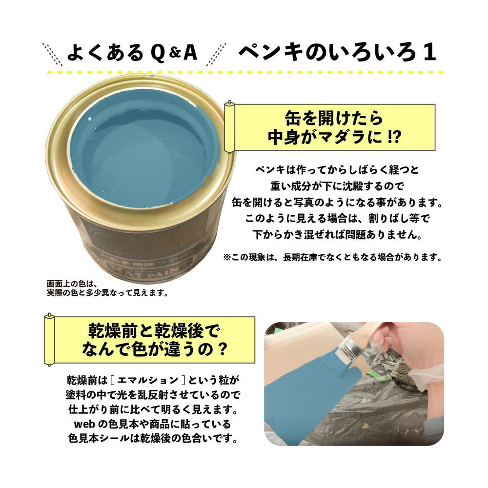 ・[乾燥時間・塗面積について]乾燥時間、塗面積の表示は、気象条件・塗る素材・形状・塗り方などによって多少異なります。