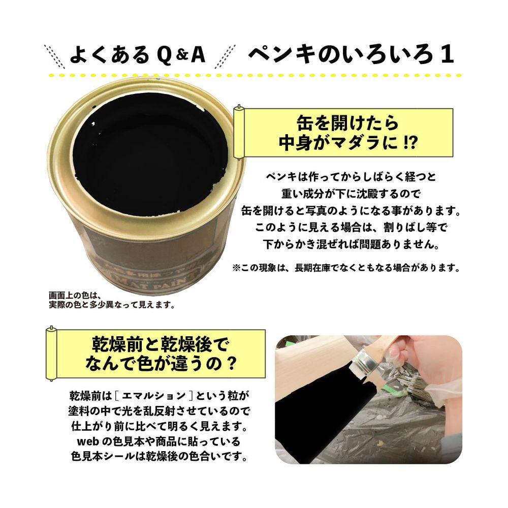 ・[乾燥時間・塗面積について]乾燥時間、塗面積の表示は、気象条件・塗る素材・形状・塗り方などによって多少異なります。