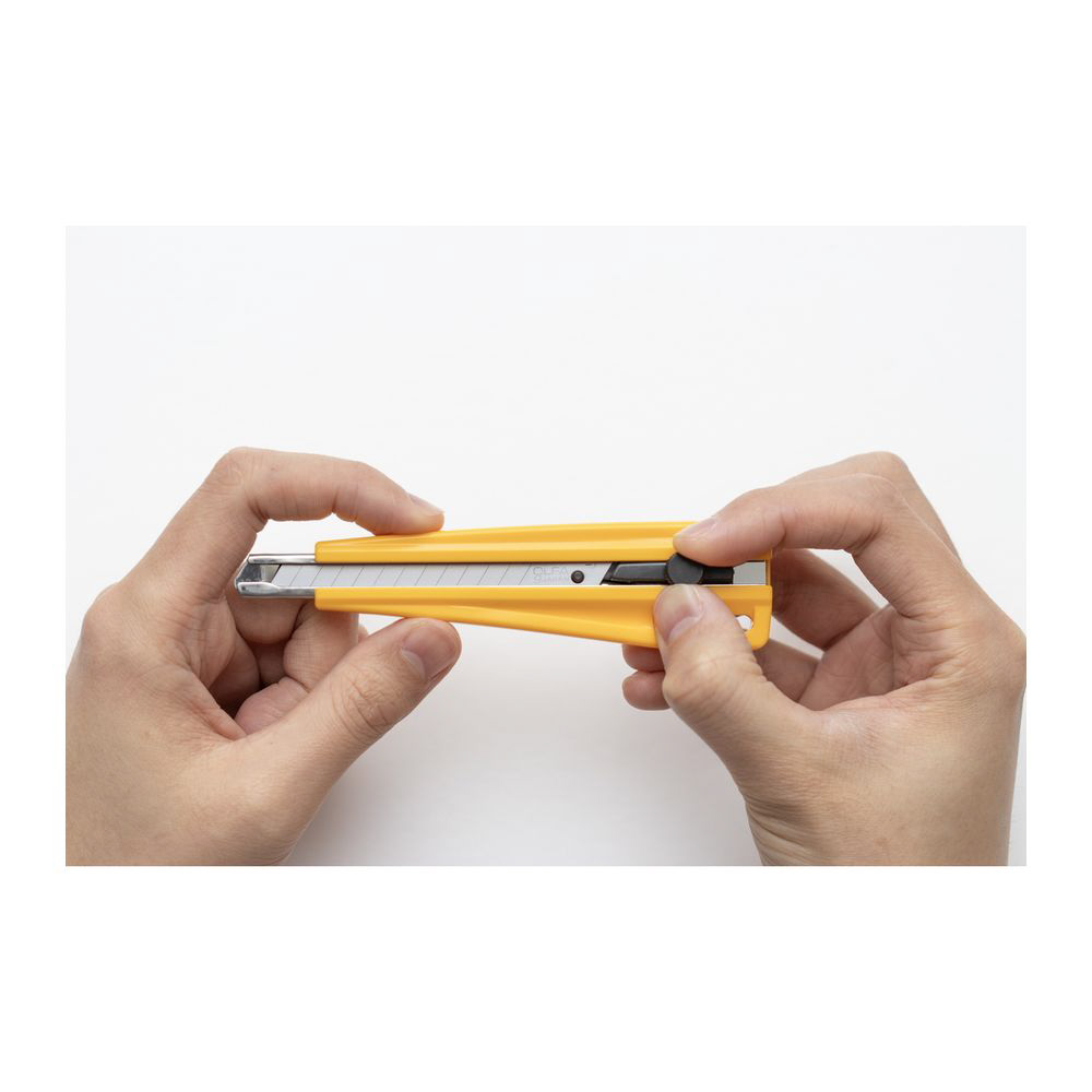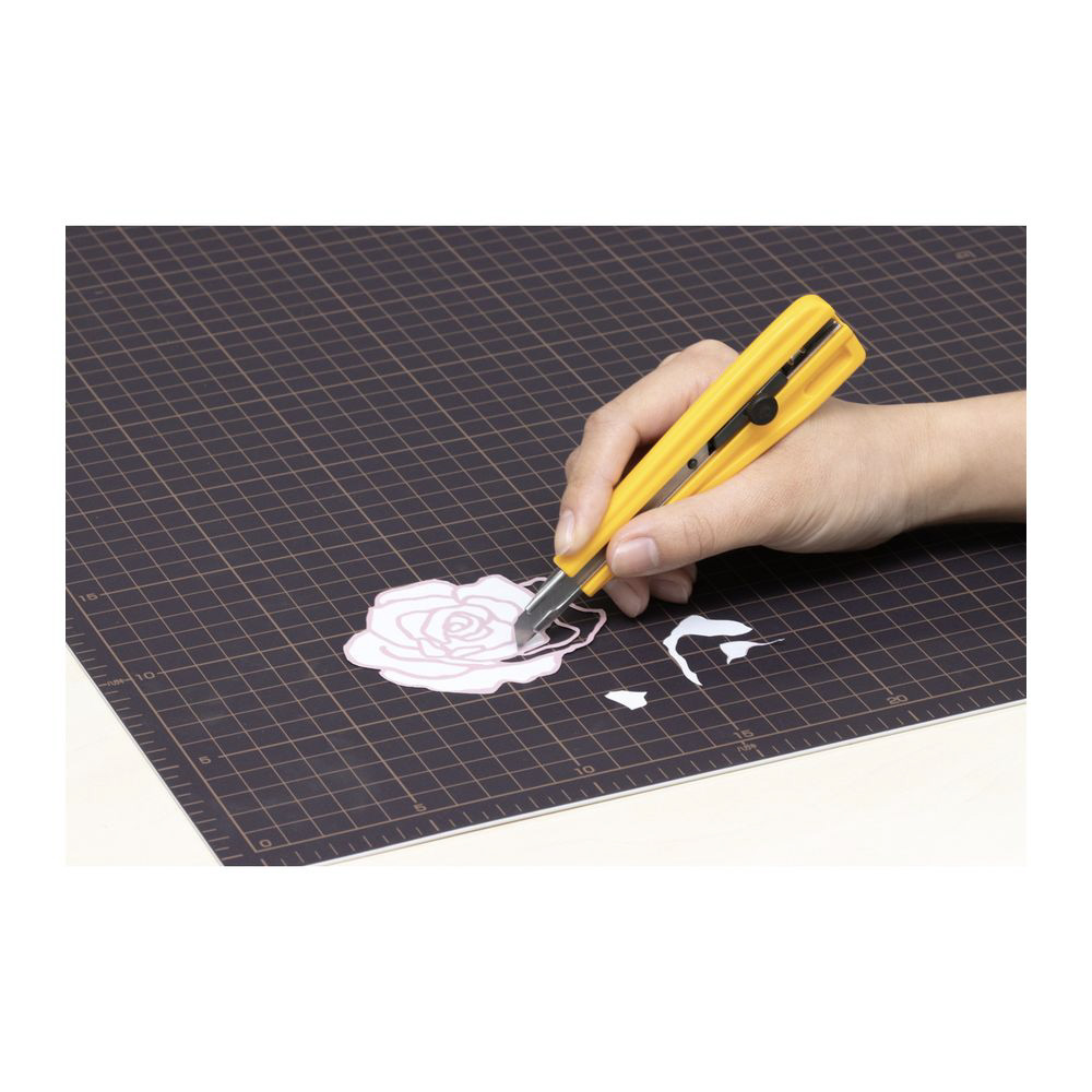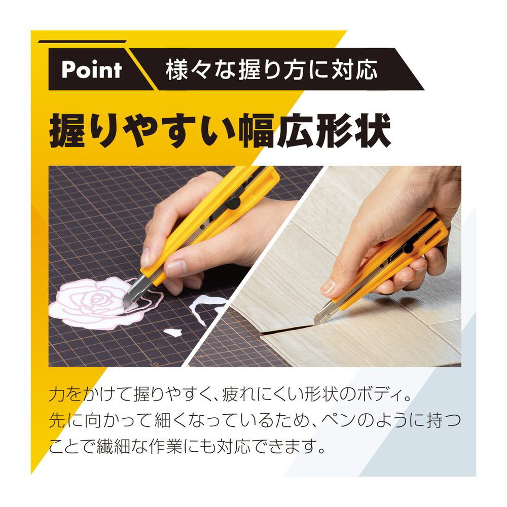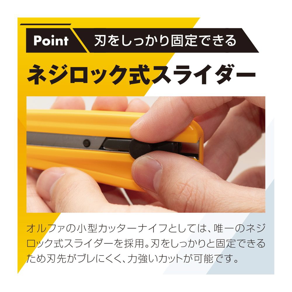 ・オルファの小型カッターナイフとしては、唯一のネジロック式スライダーを採用。刃をしっかりと固定できるため刃先がブレにくく、力強いカットが可能です。