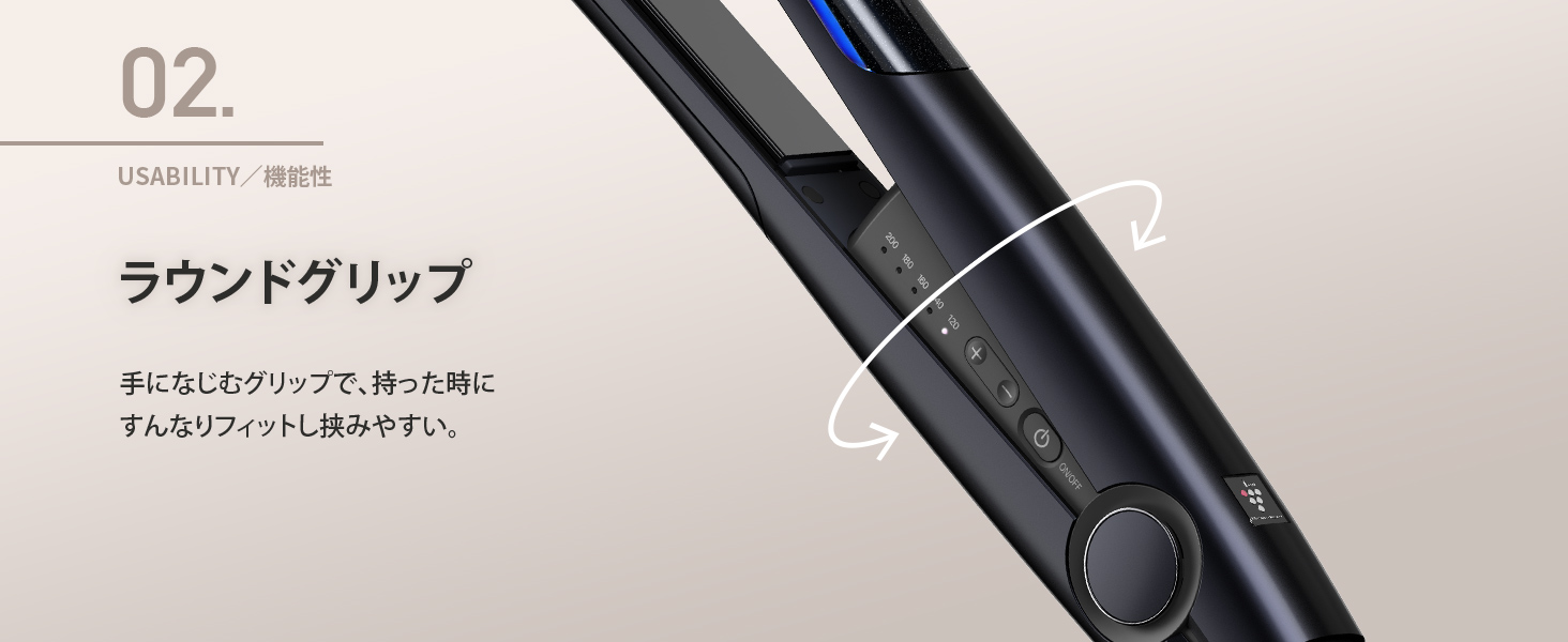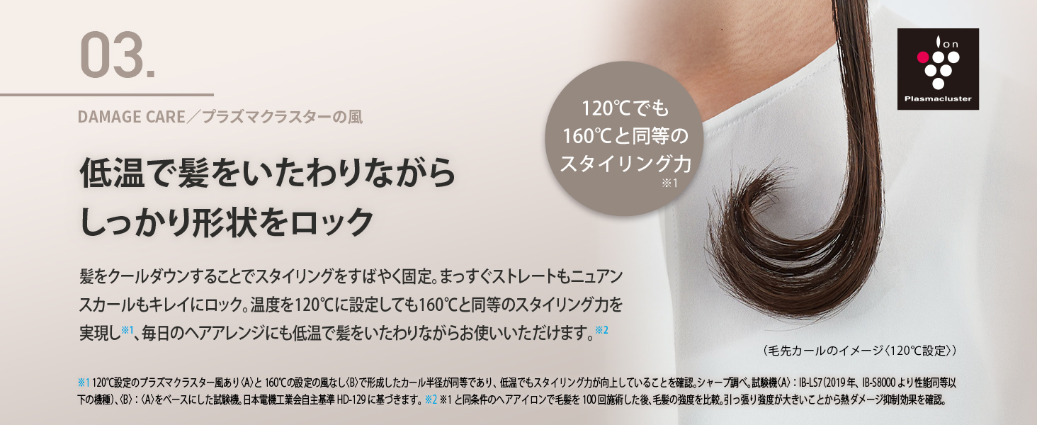 温度を120℃に設定しても160℃と同等のスタイリング力を実現し2※、毎日のヘアアレンジにも低温で髪をいたわりながらお使いいただけます3※。