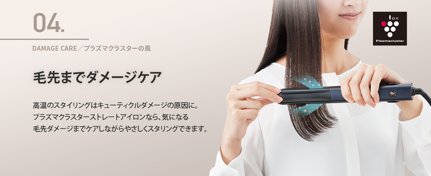 高温のスタイリングはキューティクルダメージの原因に。プラズマクラスターストレートアイロンなら、気になる毛先ダメージまでケアしながらやさしくスタリングできます。