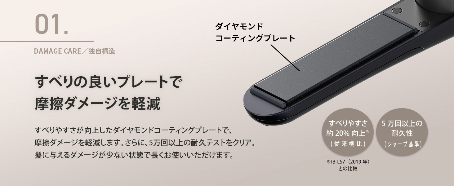 すべりやすさが向上したダイヤモンドコーティングプレートで、摩擦ダメージを軽減します。さらに、5万回以上の耐久テストをクリア。髪に与えるダメージが少ない状態で長くお使いいただけます。