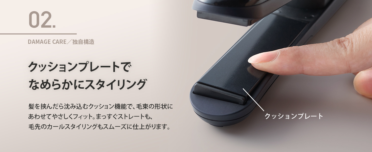 髪を挟んだら沈み込むクッション機能で、毛束の形状にあわせてやさしくフィット。まっすぐストレートも、毛先のカールスタイリングもスムーズに仕上がります。