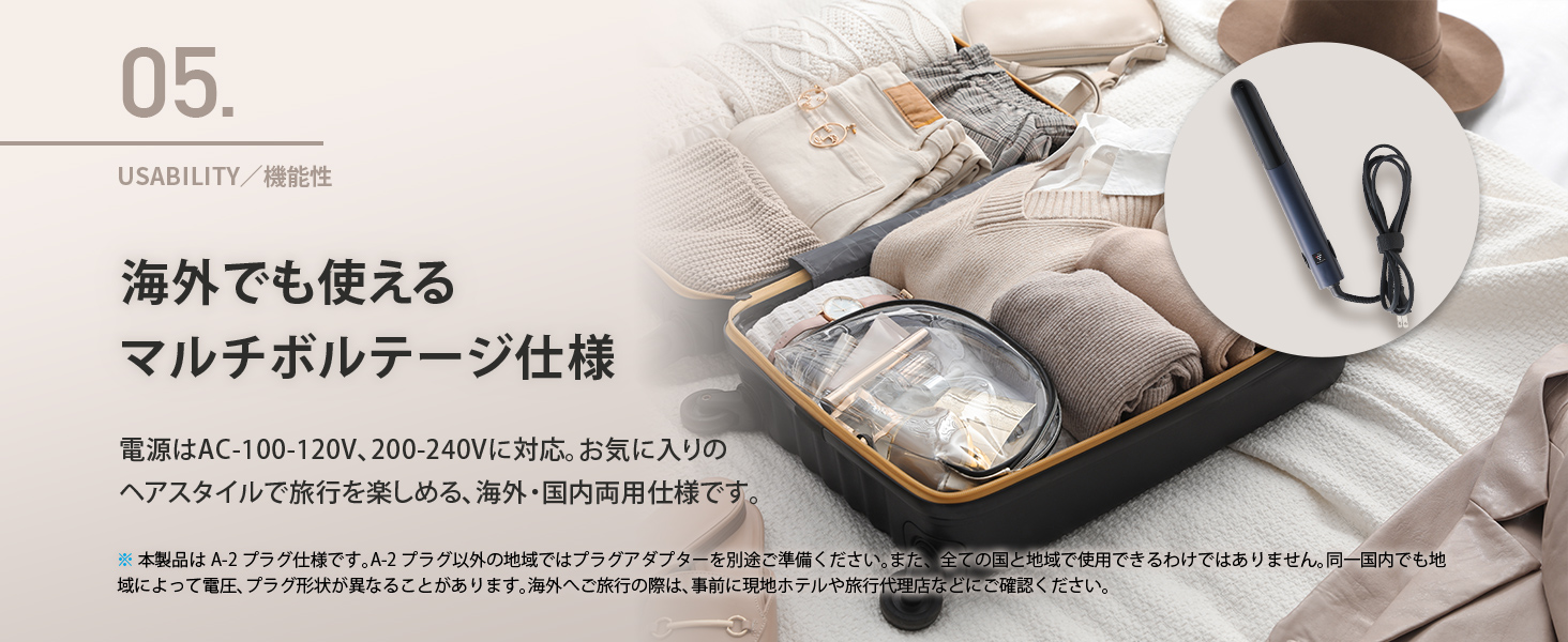 ●100-120V、200-240Vに対応。お気に入りのヘアスタイルで旅行を楽しめる、海外・国内両用仕様(マルチボルテージ)