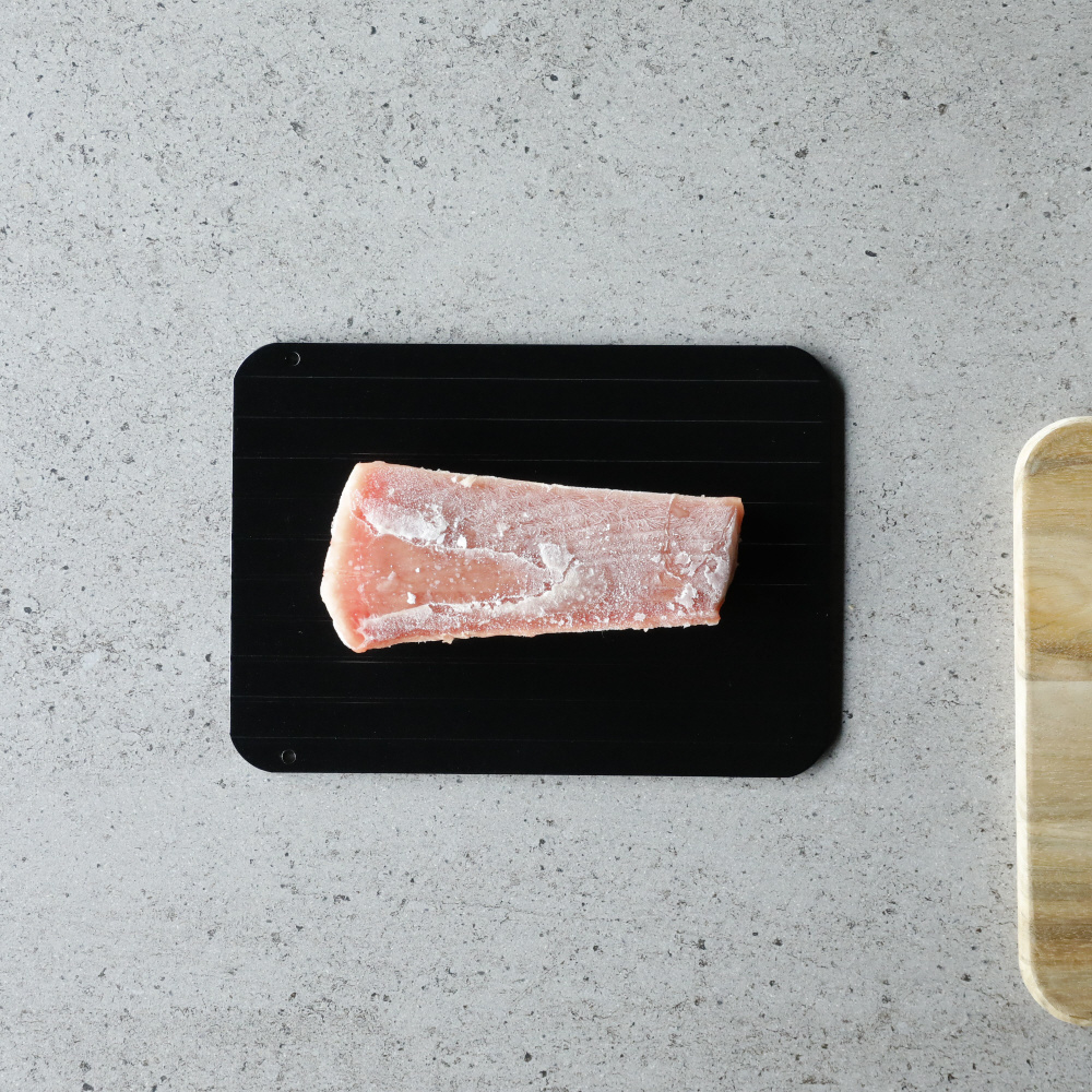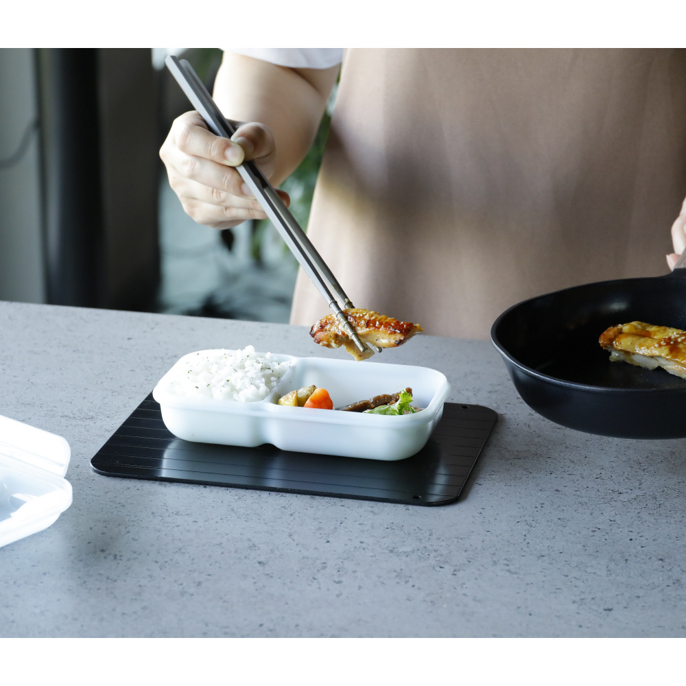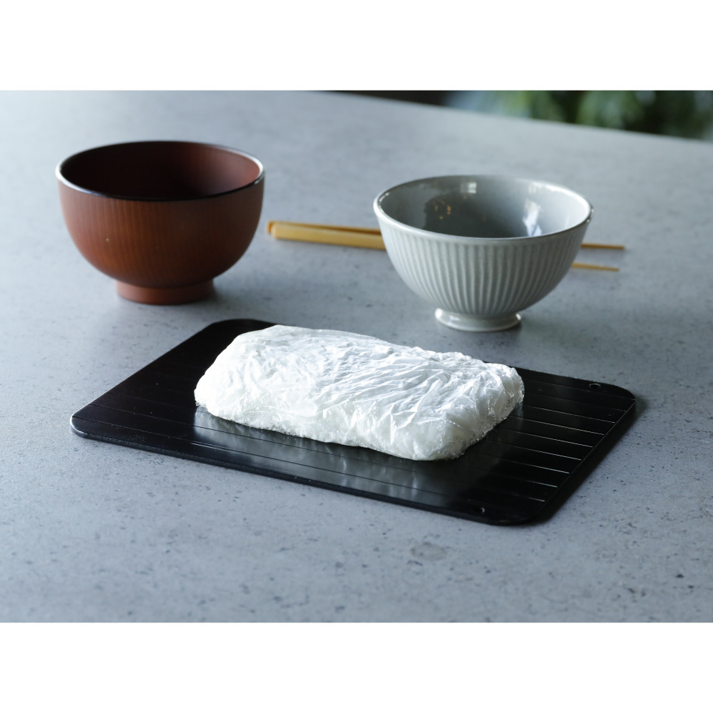 載せるだけで素早く解凍!食材を上に置くだけで、自然解凍の約6倍の速さで解凍できます。お刺身の冷凍の柵を優しく解凍できます。加熱をしないので、お刺身に最適です。溝があるので、食材が汁で浸りません。お弁当や炊き立てご飯の粗熱取りに。忙しい朝に、弁当を盛りつけながら粗熱をとれるので時短になります。炊いたご飯の粗熱をサッと取って冷凍保存できます。冷凍庫に入れれば、上に載せた物の冷却を促進させ、冷凍を早めます。冷凍庫に入れやすいミニサイズなので、急速冷凍にも便利です。【仕様】食器洗浄機使用可能