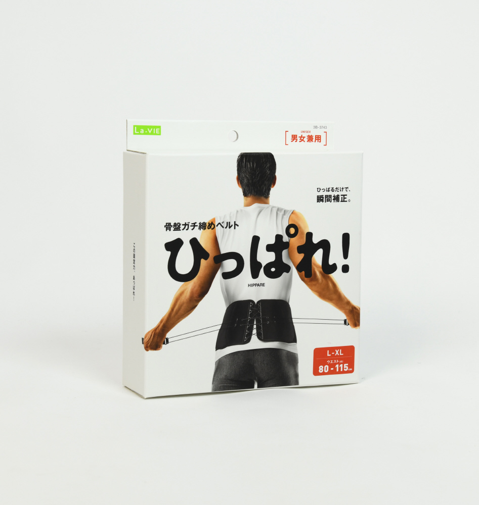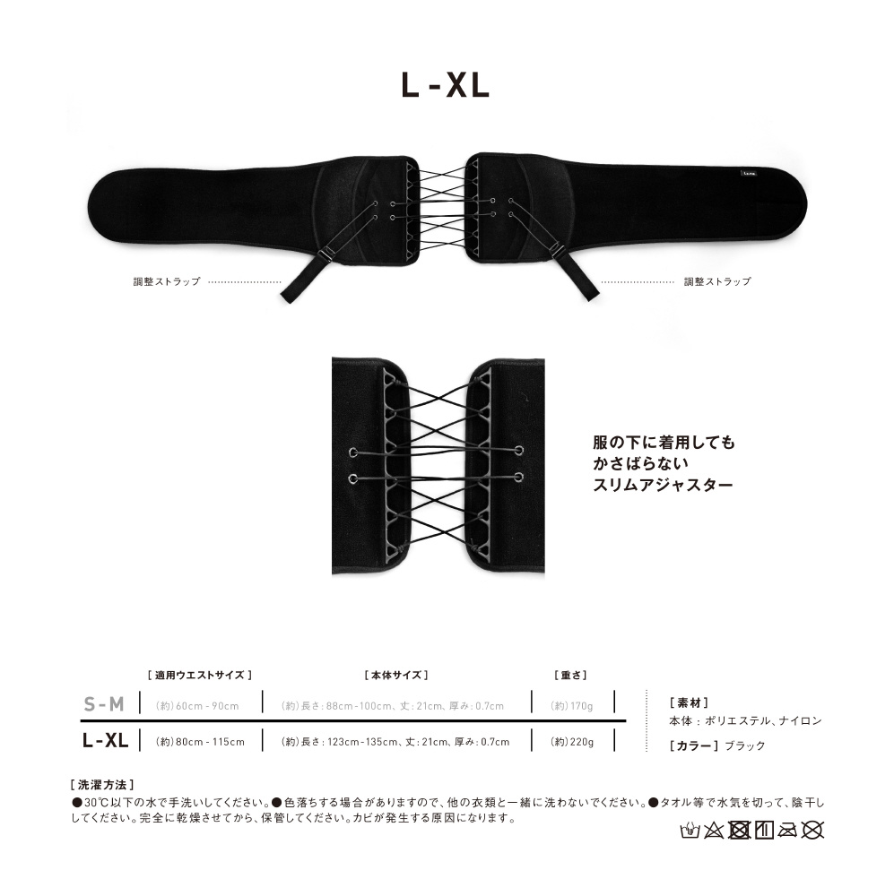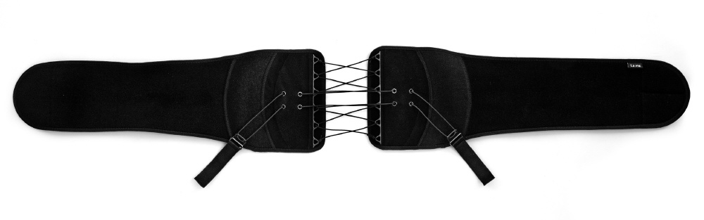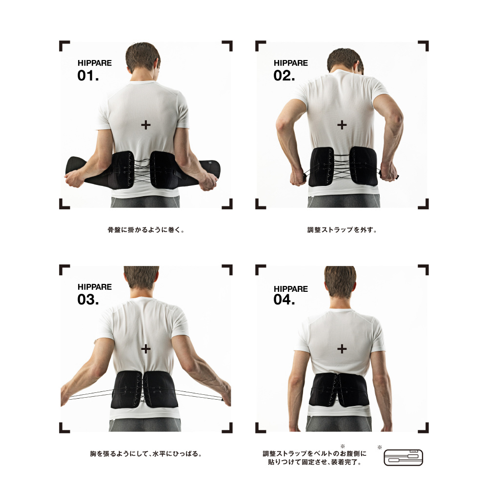 腰に巻き付けて、背中から出ているヒモをひっぱるように広げると、腰を締め付け安定させます