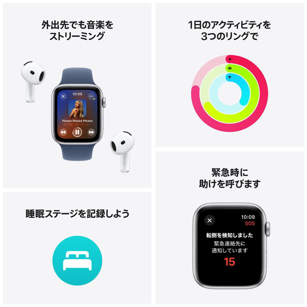 アクティブに過ごしながらモチベーションをキープする。いつもつながる。健康状態を記録する。安全を守る。そのために欠かせない機能をすべて搭載。watchOS 11の登場で、より賢く、よりあなたらしく、よりつながれるデバイスに。転倒検出や強化されたワークアウトの計測方法なども使えるApple Watch SEは、たくさんの魅力を、これまで以上にたくさんの腕に届けます。