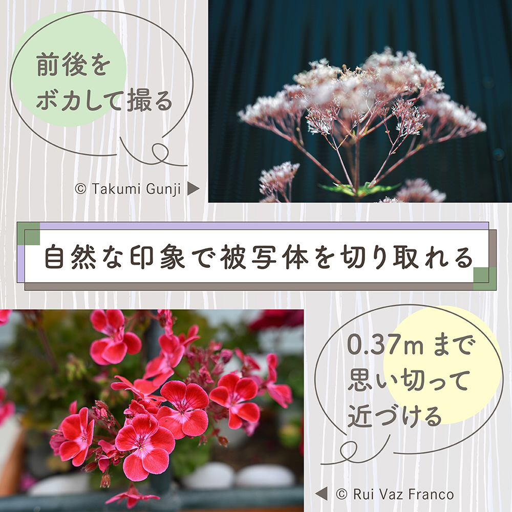 最短撮影距離は0.37mで被写体との距離が近くてもピントが合います。また、小型・軽量な設計で毎日の持ち運びも快適。