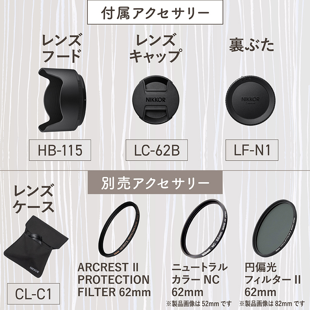 | 付属品 | レンズキャップ LC-62B(スプリング式)、裏ぶた LF-N1、レンズフード HB-115 |