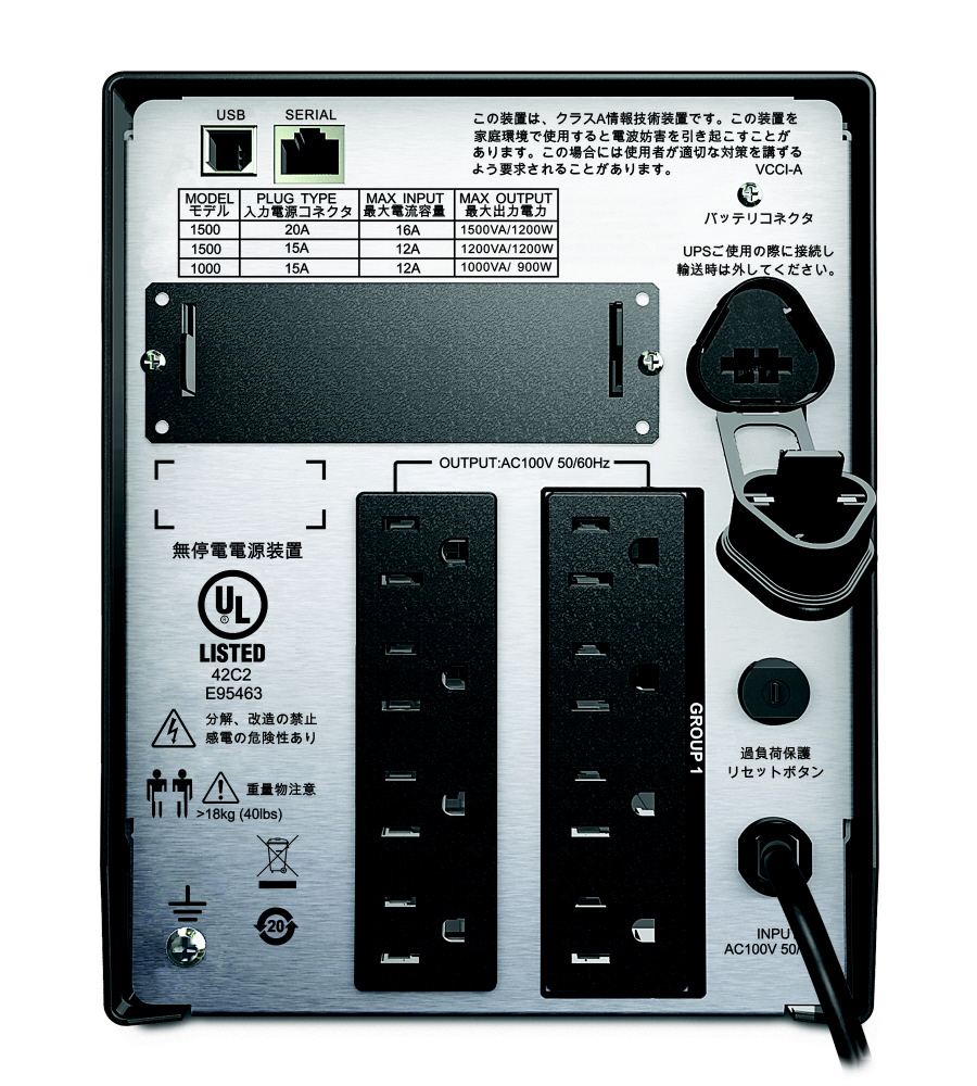 | 仕様1 | [定格入力電圧]100V [定格出力電圧]100V [定格電力]670W [定格電力]1000VA [製品またはコンポーネントタイプ]無停電電源装置 (UPS) [入力プラグ形状]NEMA 5-15P [出力コンセント形状×数]8 NEMA 5-15R [ラックユニット]0U [ケーブルの長さ]1.8 m [ケーブルの数]1 [バッテリー形式]鉛蓄電池 [製品群]Smart-UPS [通信ポートの種類]スマートスロット |