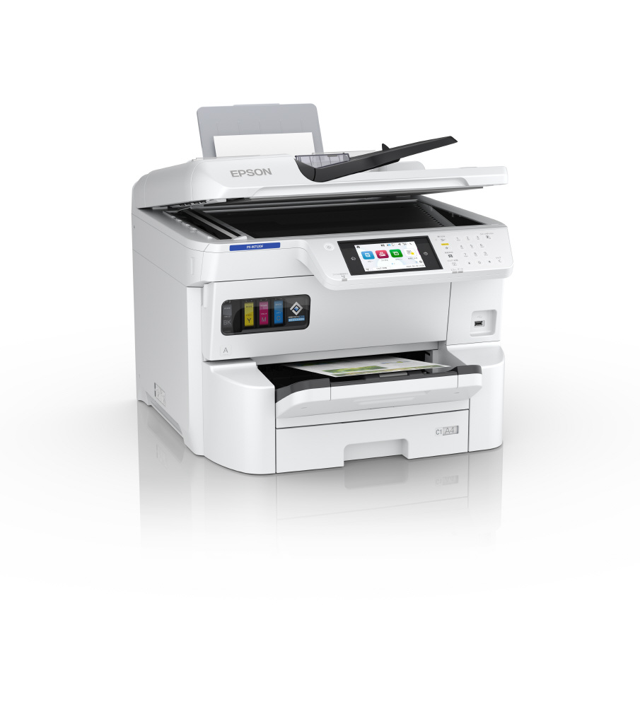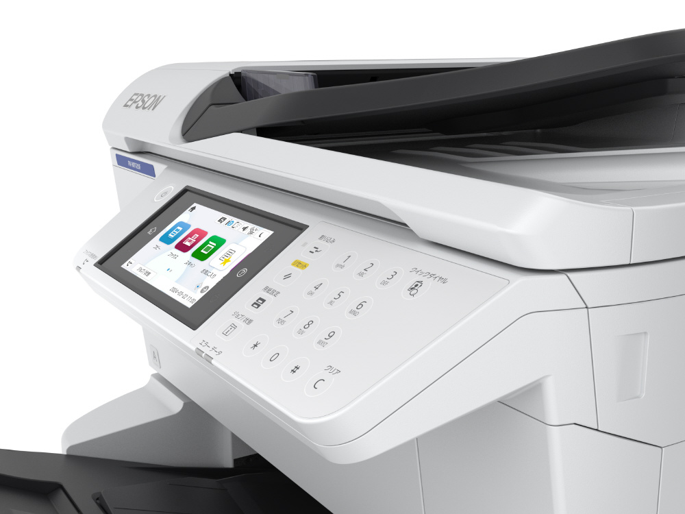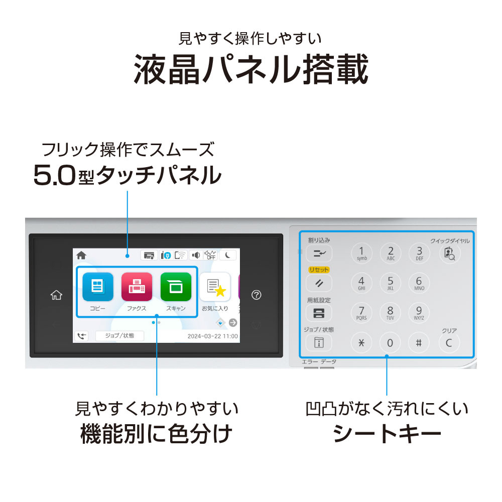 新しいUIを搭載した操作パネル、汚れにくいシートキーを採用した操作ボタン、新しいデザインのインク窓など、ストレスなく快適に操作できるよう使い勝手を向上しました。新しいUIではホーム画面の各機能にそれぞれ色を割り当てているため、わかりやすく、誰でも迷わずに操作できます。大容量のインクカートリッジはインク窓から一目で場所がわかるため、誰でも簡単に消耗品交換が可能で、ダウンタイムの削減に貢献します。