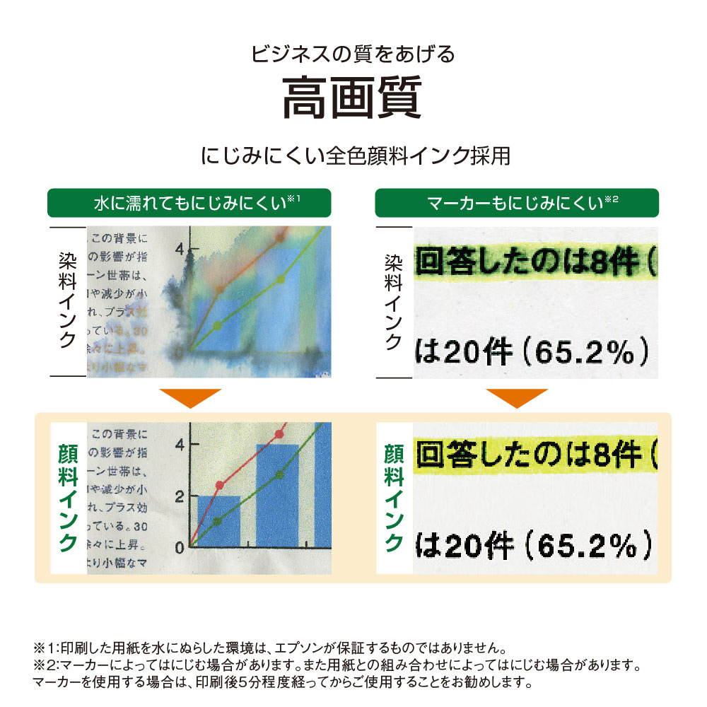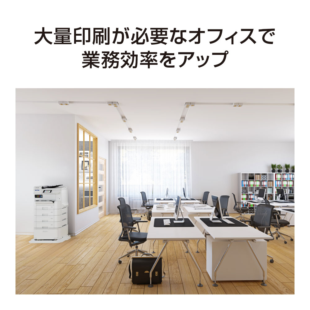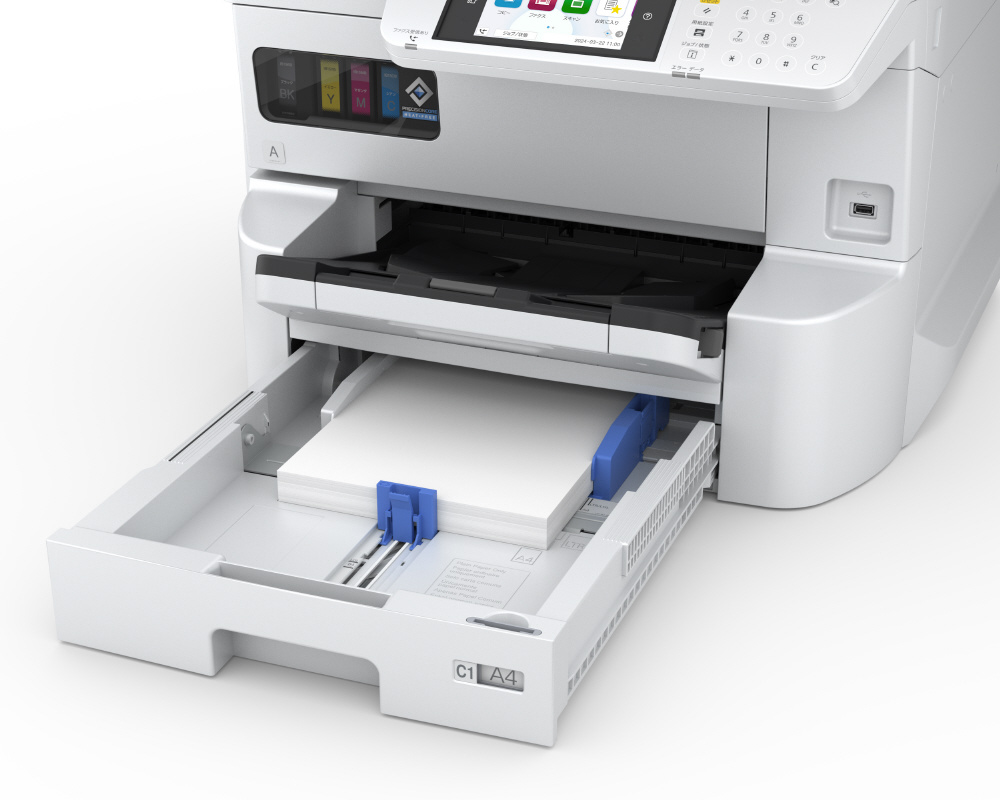 1分間にカラー約24枚、モノクロ約25枚の高速連続プリントとカラー/モノクロとも約5.5秒の高速ファーストプリントを実現しました。最大5WAY給紙で1,985枚(用紙カセット1:250枚+手差しトレイ:85枚+増設カセット:550枚×3)の大量給紙が可能。また、カラー約8,000枚・モノクロ約11,500枚がプリント可能な大容量インクカートリッジと合わせ、用紙補給やインク交換の手間を軽減するとともに、総印刷枚数60万ページの耐久性で業務プリントをしっかり支えます。