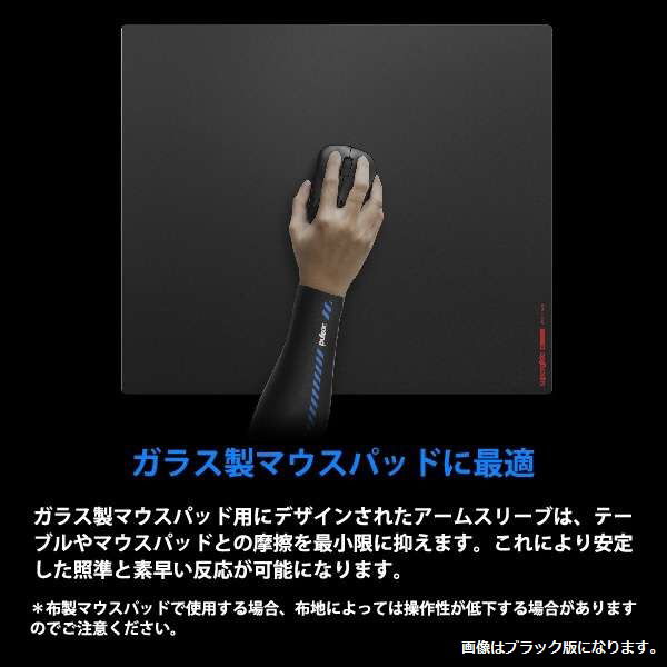 ガラス製マウスパッド用にデザインされたアームスリーブは腕とテーブルやマウスパッドとの摩擦を最小限に抑えます。これにより、安定した照準と素早い反応が可能になります。