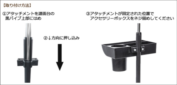 アクセサリーボックスマンハセットの譜面台に取り付けられるアクセサリーボックスです。細々した演奏必需品がすぐ手の届くところに欲しい時に大変便利です。※M2400 シャフトロックとの同時使用はできません。