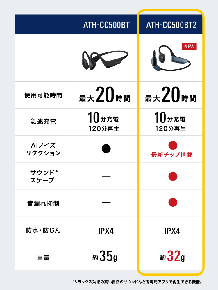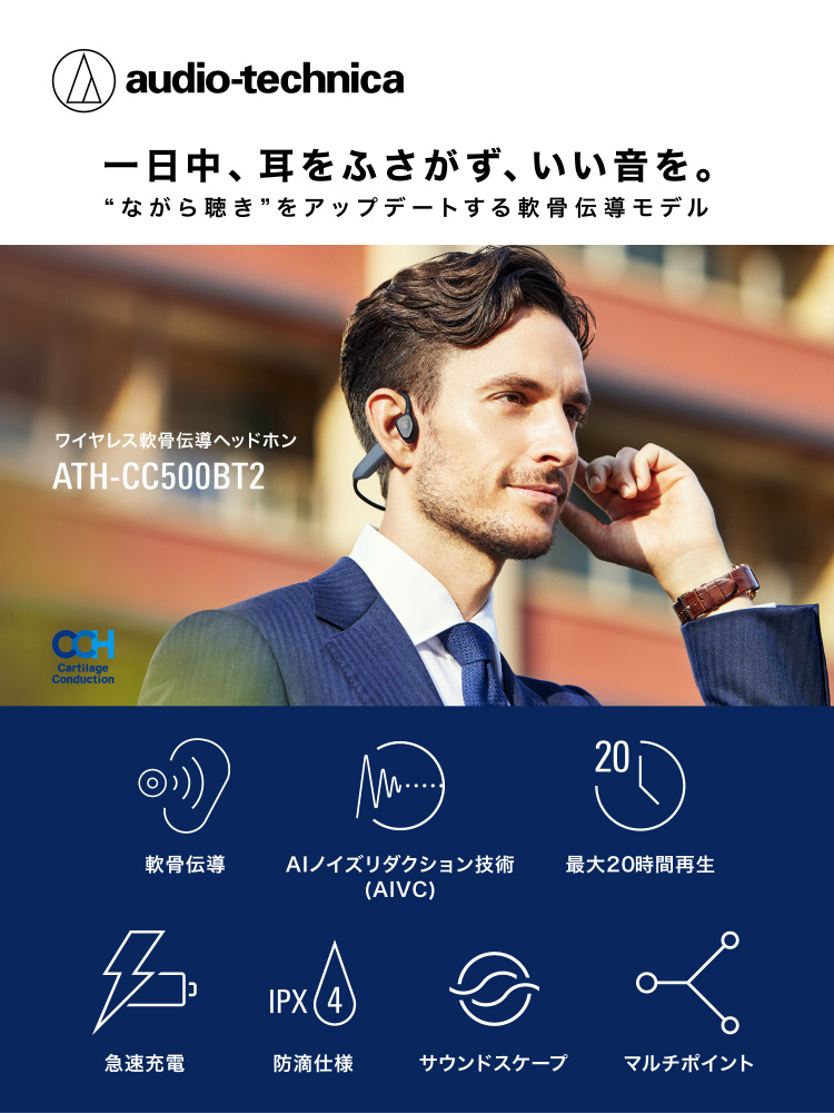 より良い音質と普段使いの快適さを兼ね備えた、次世代の軟骨伝導ヘッドホン ATHCC500BT2。あなたの一日を支える、心強いパートナーです。