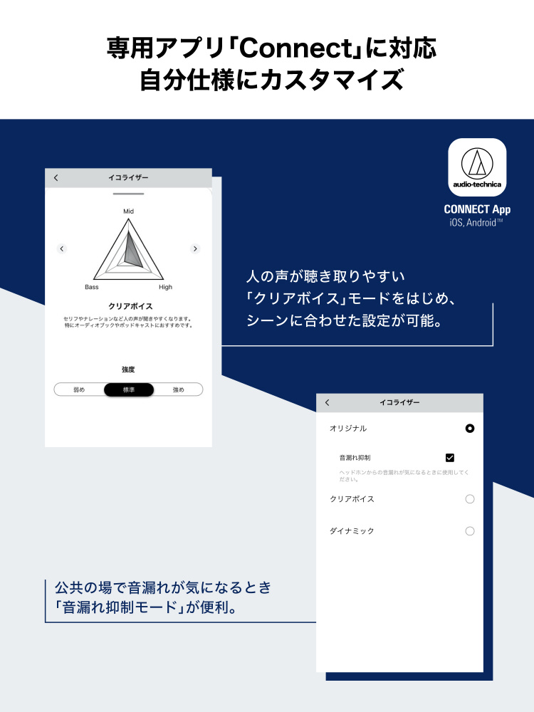 家事や仕事をしながら、散歩やアウトドアを楽しみながら、周りの音とともに聴きたい音楽やオーディオブックを、いい音でじっくりと楽しむことができます。オーディオテクニカ専用アプリ「Connect」を使って、イコライザーから「クリアボイス」を選択すれば、セリフやナレーションがさらに聴き取りやすくなります。また、通話性能もさらにアップデート。より自然な声質で、クリアな通話をすることができます。耳に優しい着け心地と重量バランスの見直しにより、前モデルと比較して、長時間着けても疲れにくいデザインに仕上げています。