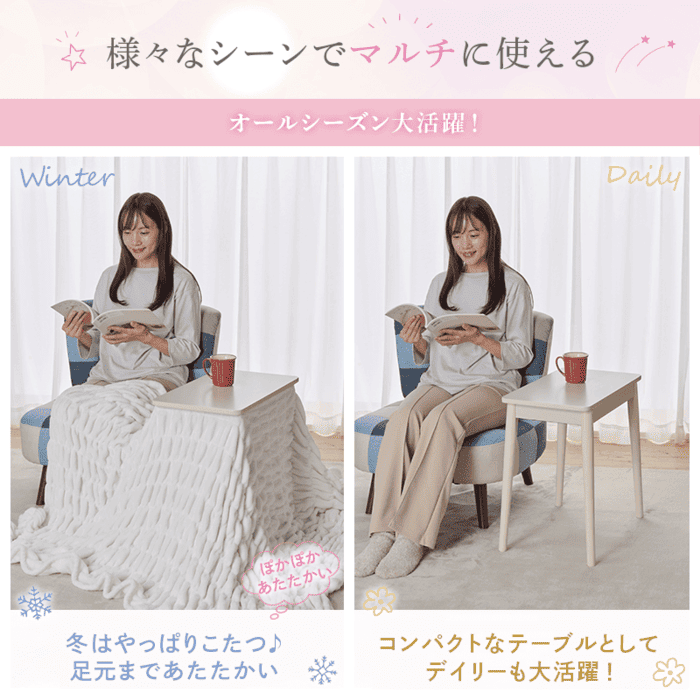 こたつにテーブルに、様々な使い方ができるから一年中出しっぱなしでOK!片づけの手間もなく、収納場所にも困りません。