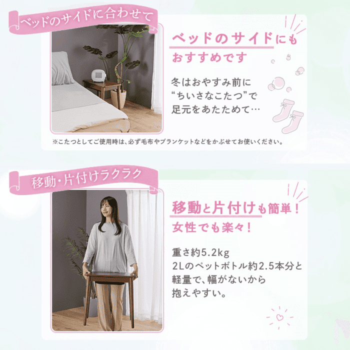 ベッドサイドに合わせて、寝る前に足元を温めることも可能。コンパクトなので部屋間の移動もらくらく!
