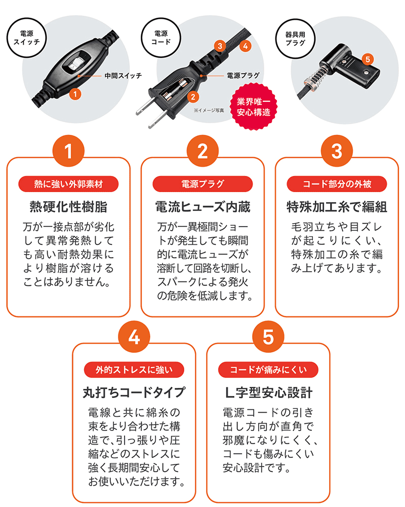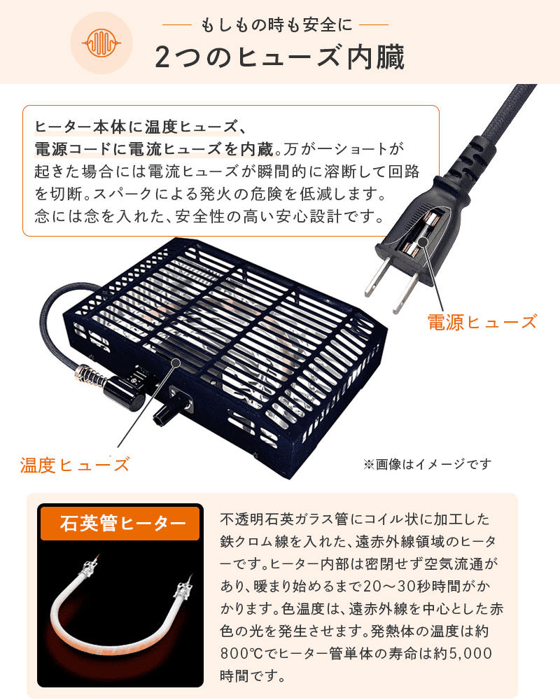 ・安全装置:(本体)温度ヒューズ、(電源コード)電源ヒューズ