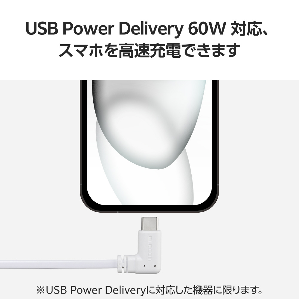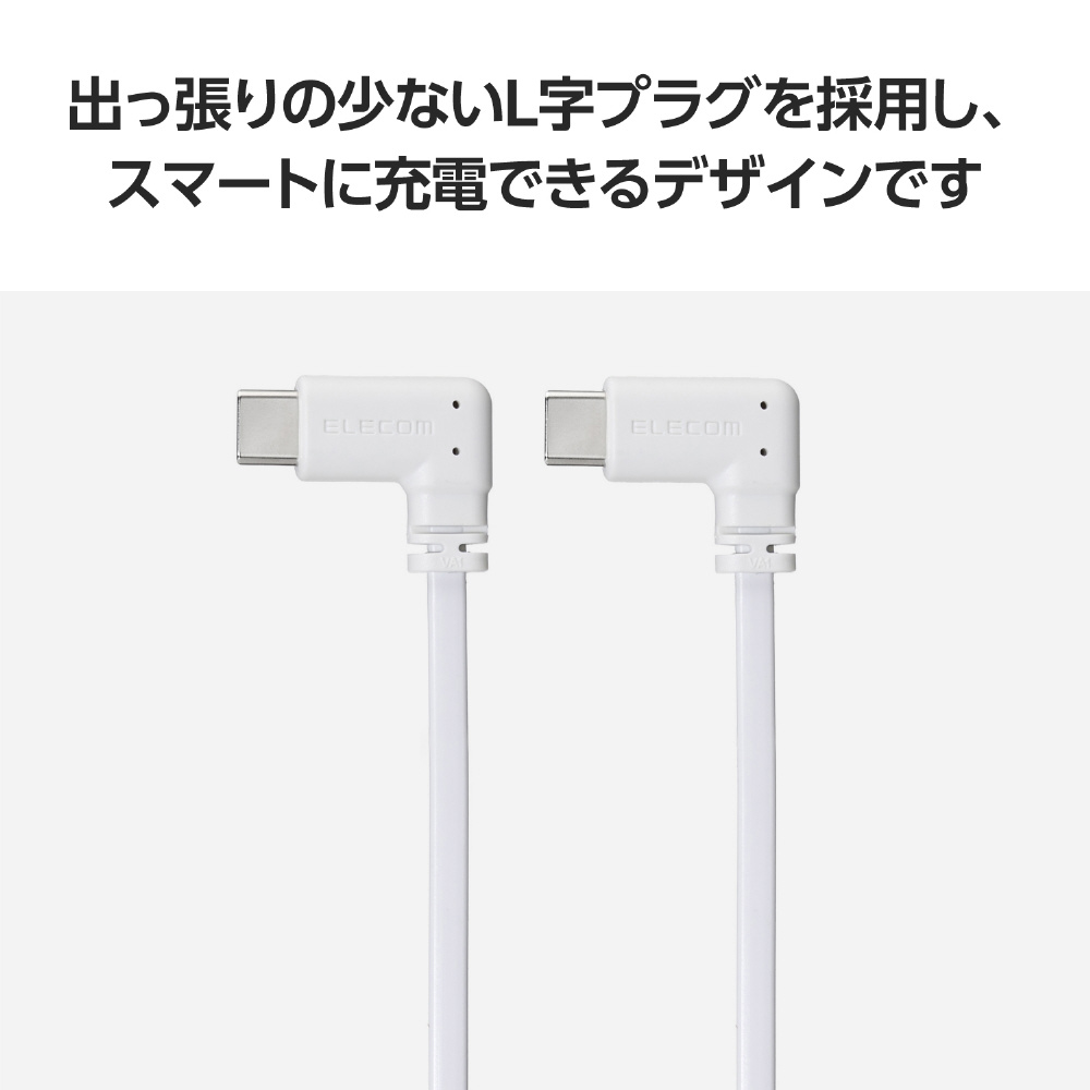 モバイルバッテリーでのスマートフォンやタブレットの充電に!USB Power Delivery(最大60W)で充電可能な充電専用USB Type-C(TM) - USB Type-Cケーブルです。出っ張りの少ないL字プラグと短尺フラットケーブルで接続しやすく、コンパクトで持ち運びにも便利です。