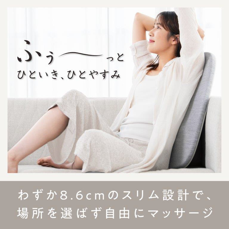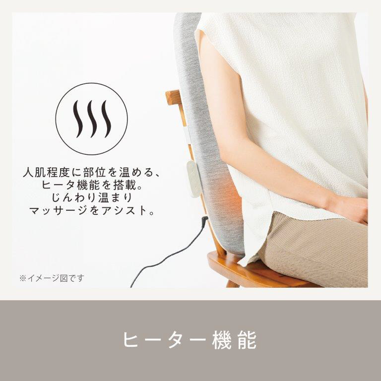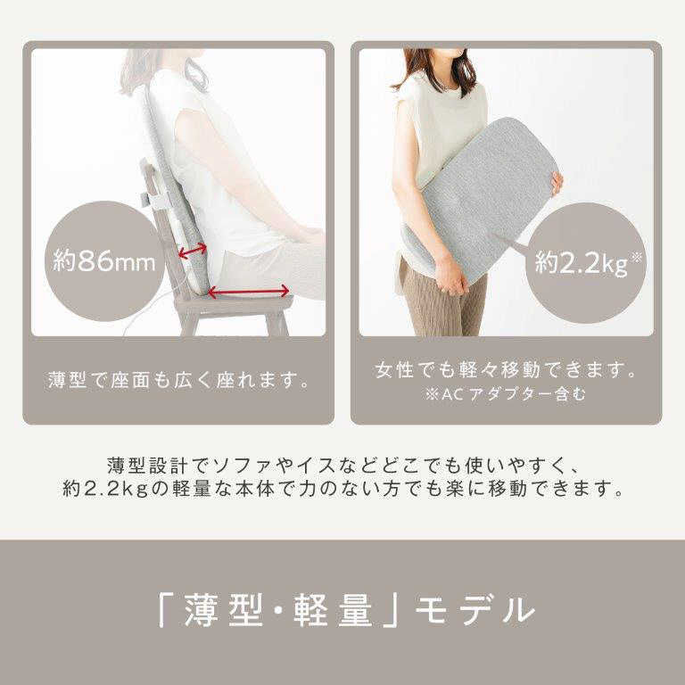 利便性を追求したスリム設計のシートマッサージャー・軽量・コンパクトながらヒーター機能、3種類のコース搭載・使用中のズレを予防する固定バンド付き
