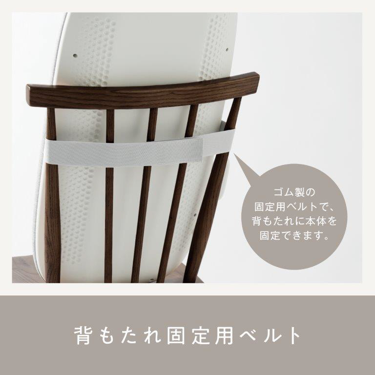 多様な椅子に対応し、使用中のズレを予防する固定バンド付き。