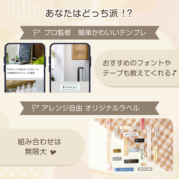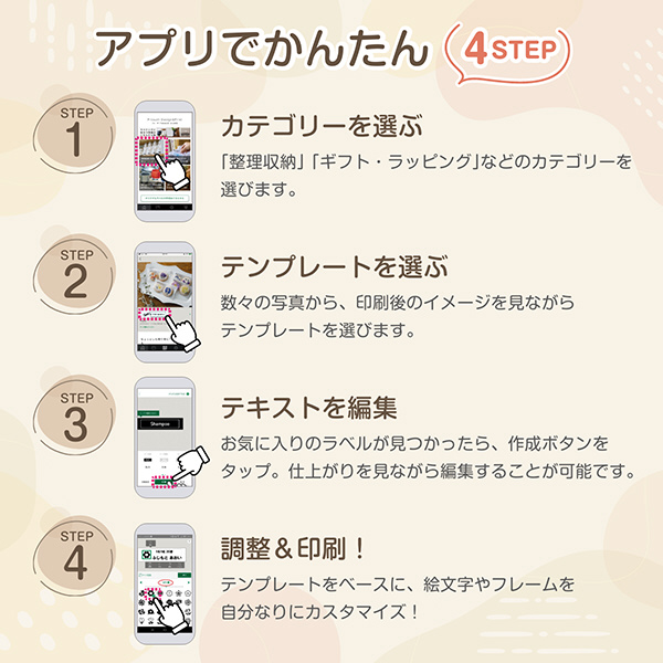 専用のスマートフォンアプリでは、用途に合わせた豊富なテンプレートが揃っています。テキスト入力だけで誰でも簡単におしゃれラベルを作成可能。