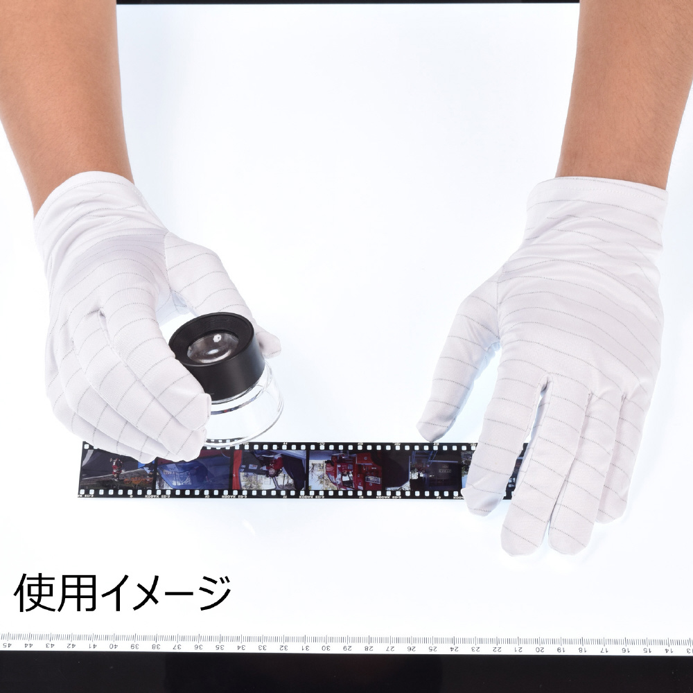 静電気やホコリの付着を防ぐ導電糸を編み込んだ制電手袋。ポジ・ネガの扱い、ムービーフィルムの編集、物撮りの製品取り扱いなどに最適です。宝石や貴金属の取り扱いにも使えます。