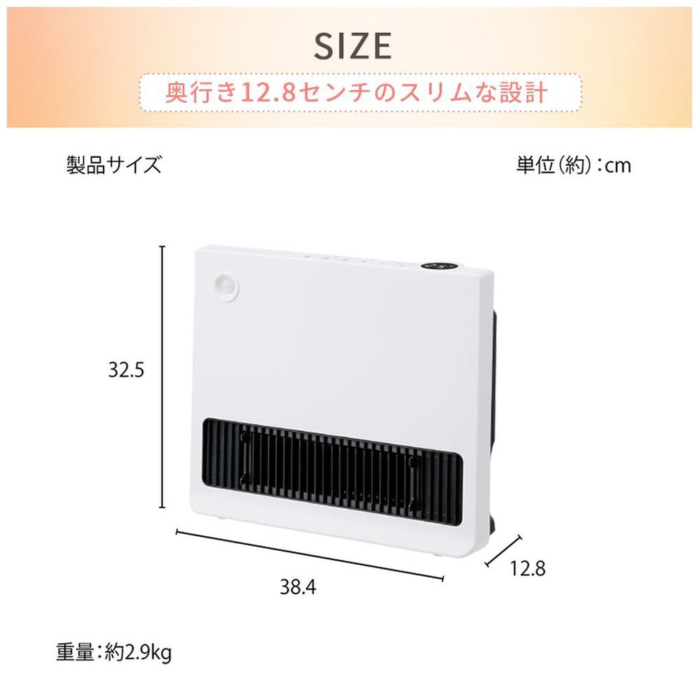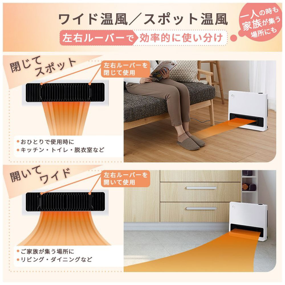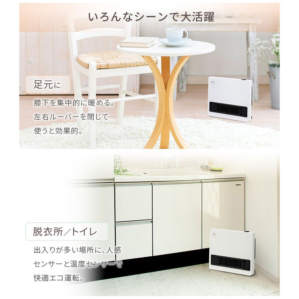 人感・温度センサーW搭載で省エネ。広範囲を暖めるワイドセラミックヒーター。