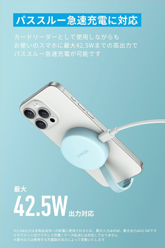 カードリーダーとして使用しながらもお使いのスマホに最大42.5Wまでの高出力で パススルー急速充電が可能です。