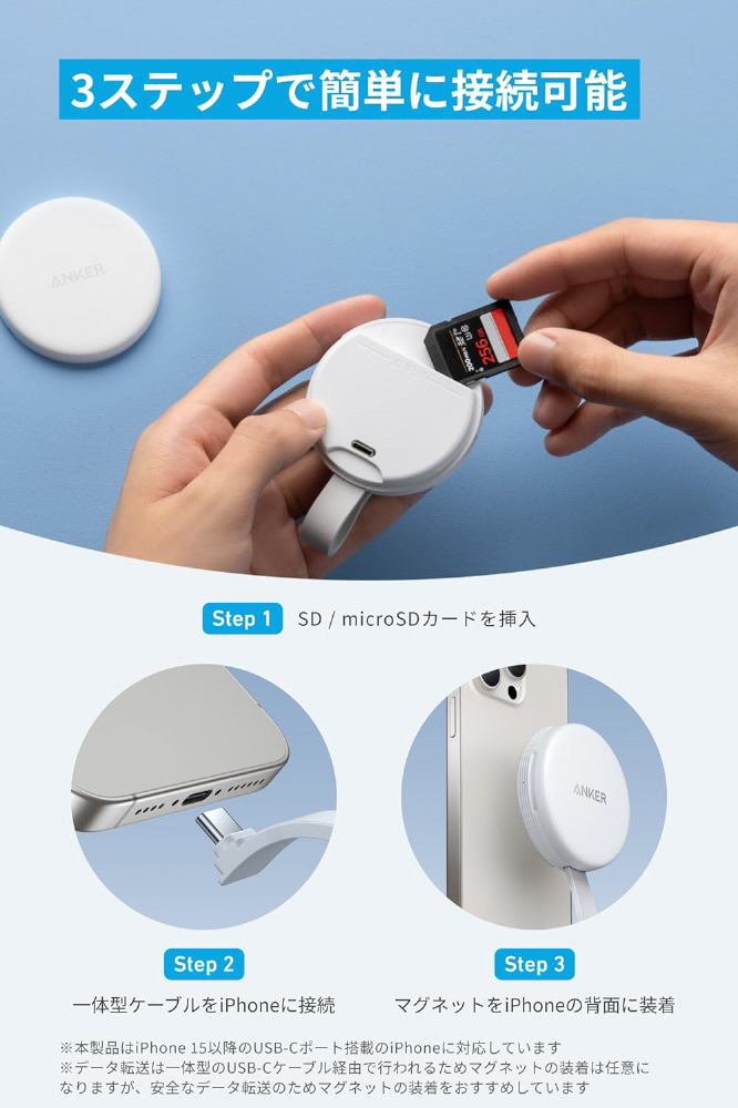 iPhone用に設計され、最大10Gbpsの高速データ転送と42.5W出力で充電が可能な、マグネット式ポータブルカードリーダー