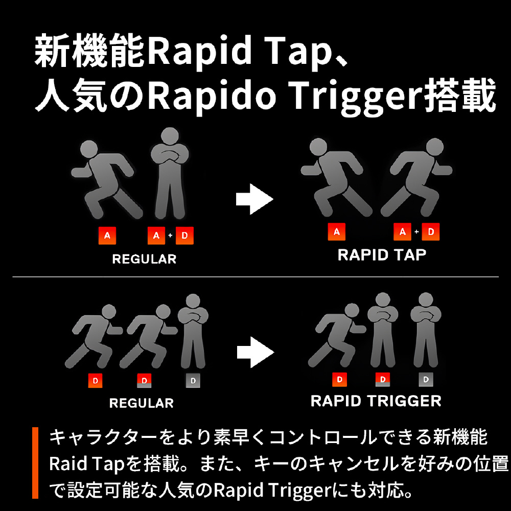 人気のRapid Triggerに加え、新機能Rapid Tap、プロテクションモード、そしてGG Quicksetなど、ゲームに勝つための新たな機能が追加されました。
