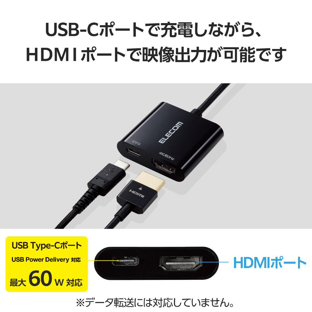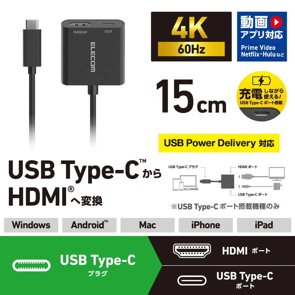 映像変換アダプタ [USB-C オス→メス HDMI /USB-Cメス給電 /USB Power Delivery対応 /60W] 4K対応(Chrome/Android/iPadOS/iOS/Mac/Windows11対応) ブラック MPA-CHDMIPD15BK 【864】