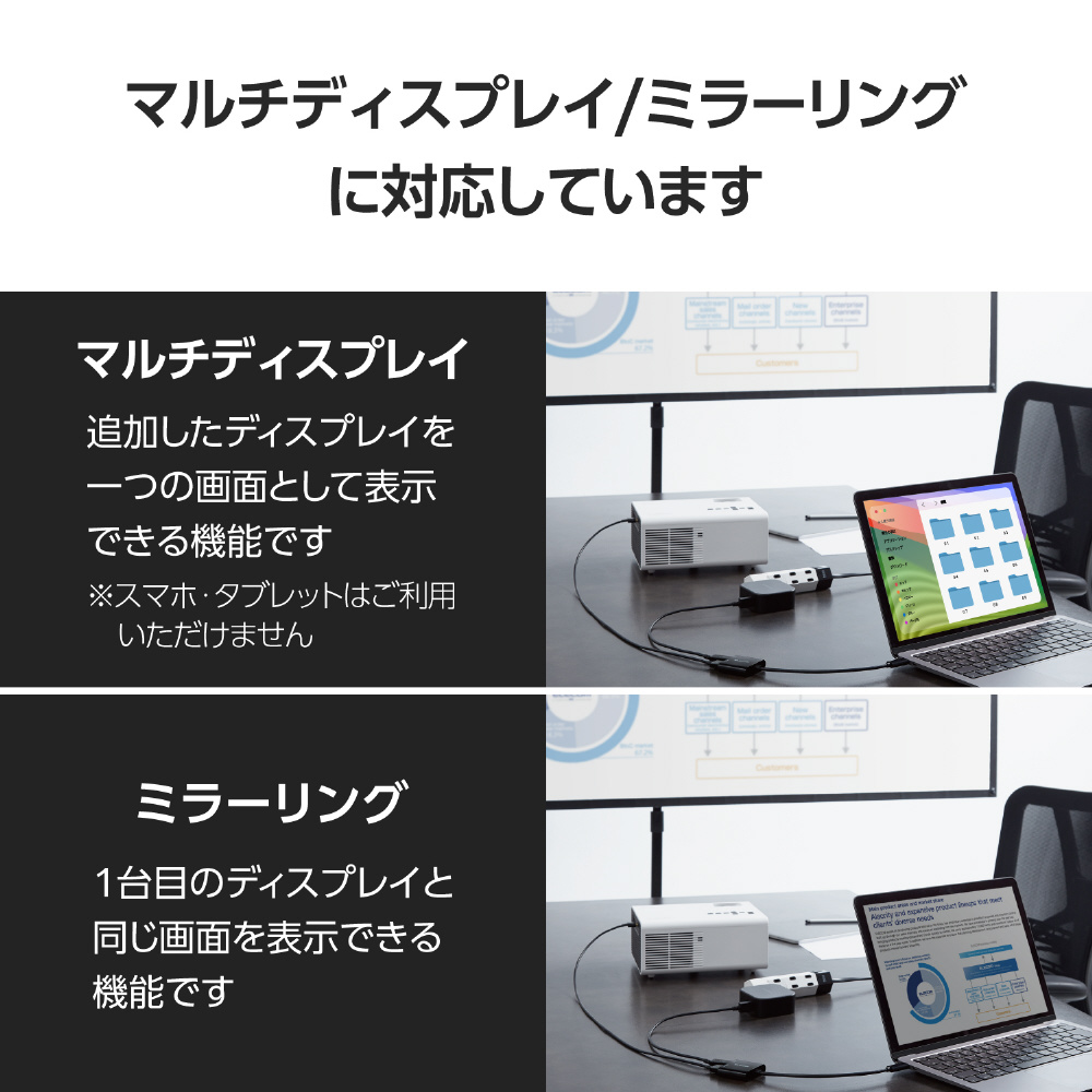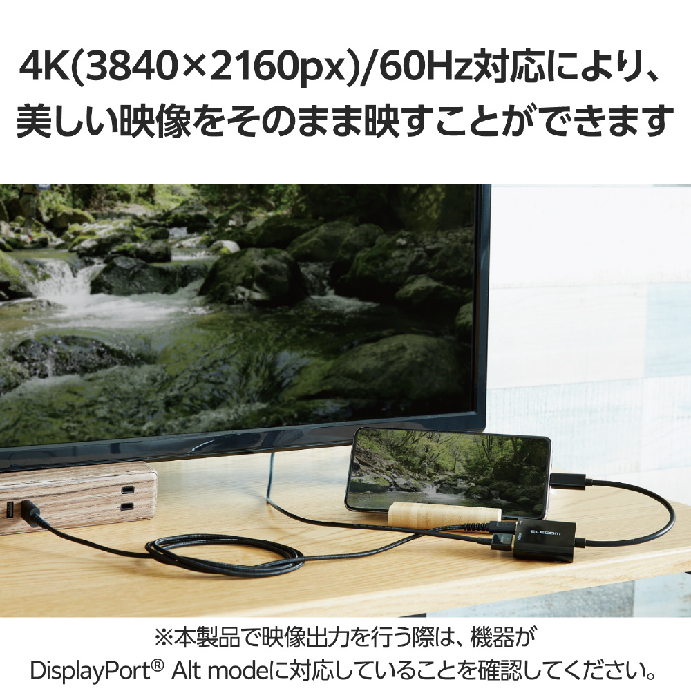 スマートフォンやパソコンなどの映像をディスプレイなどに出力できる、USB Type-C(TM)ポートをHDMI(R)ポートに変換するアダプターです。HDMIコネクター搭載ディスプレイなどに映像を出力することができ、画面複製と画面拡張に対応しています。本製品搭載のUSB Type-Cポート(充電専用)に、USB Power Delivery対応AC充電器などを接続することで、映像出力と同時に端末を充電することができます。