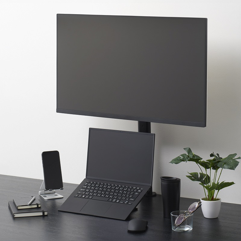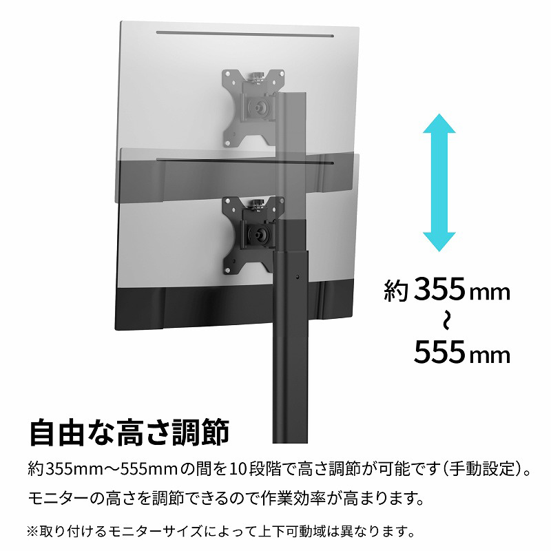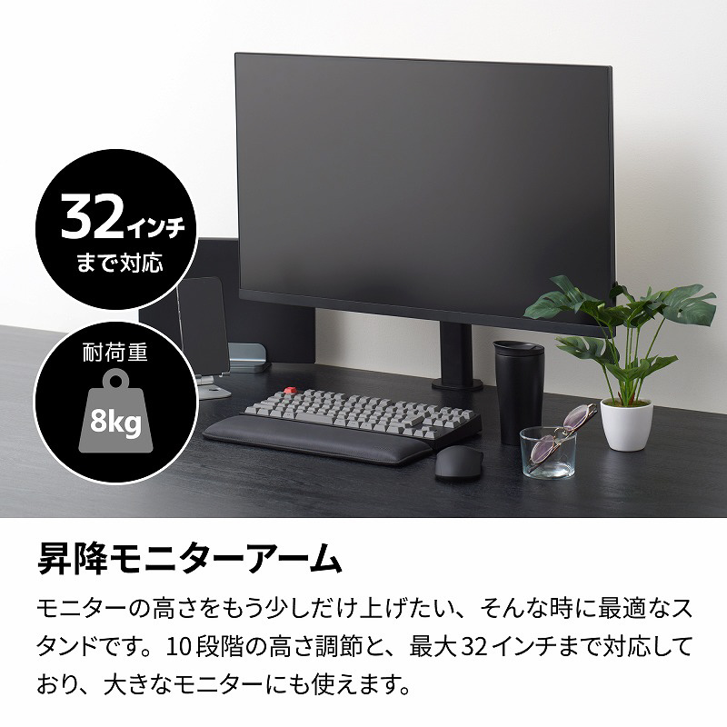 10段階で高さ調節が可能。32インチの大型モニターも、お好みの高さに。