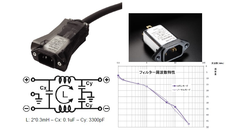 フィルターはインレットコネクターと一体化された並列コイルとコンデンサーにより構成されるフィルター回路で100KHzで約8dB、500KHzで約14dBのノイズ成分を減衰させる特性。