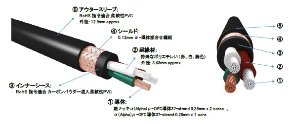 ●ケーブル導体:銀メッキα μ-OFC導体 37-strand 0.25mm×2 cores、α μ-OFC導体 37-strand 0.25mm×1core