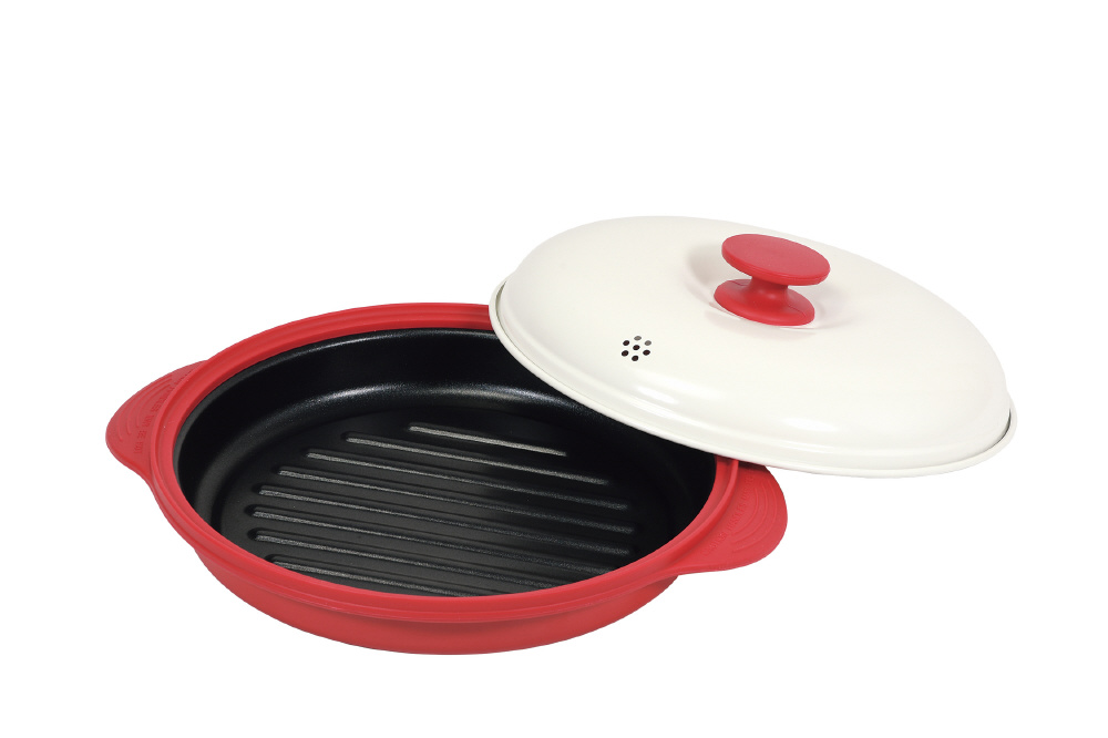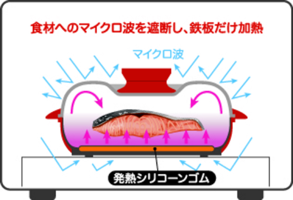 こんがり焼ける特殊構造。スピードクックは食材へのマイクロ波を遮断し、本体底のプレートがマイクロ波を熱に変換します。その為、電子レンジでフライパンのような加熱調理ができ焼き目も付けられます。