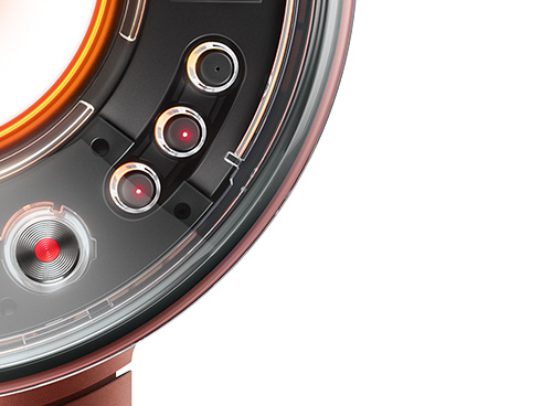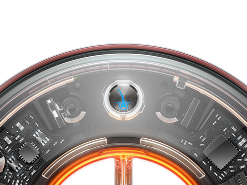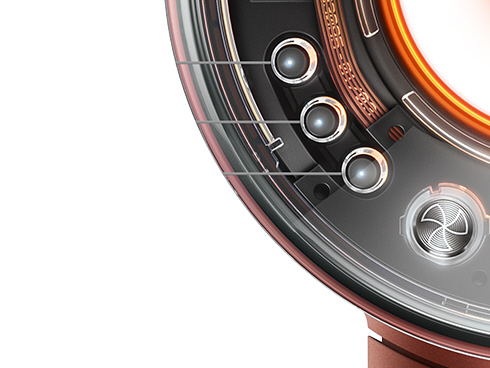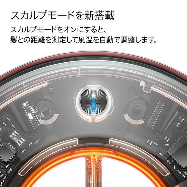 スカルプモードをオンにすると、髪との距離を測定して風温を自動で調整します。連動して、温度センサーライトが赤、オレンジ、黄で風温の変化をお知らせ。