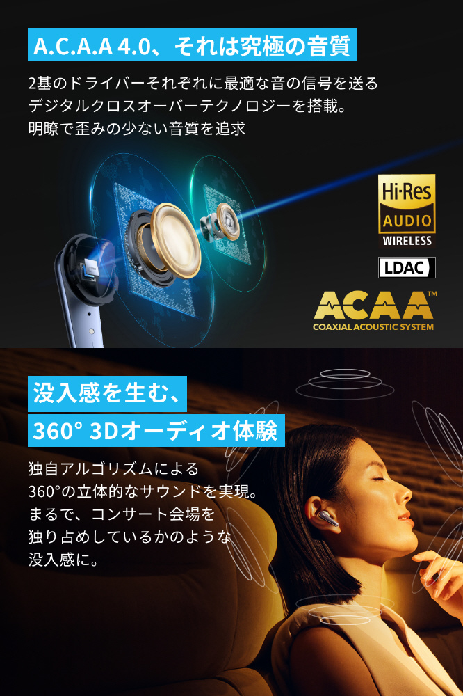 それぞれのドライバーに最適な音の信号を送る技術により、高音から低音まで明瞭で歪みの少ない音質を追求しました。
