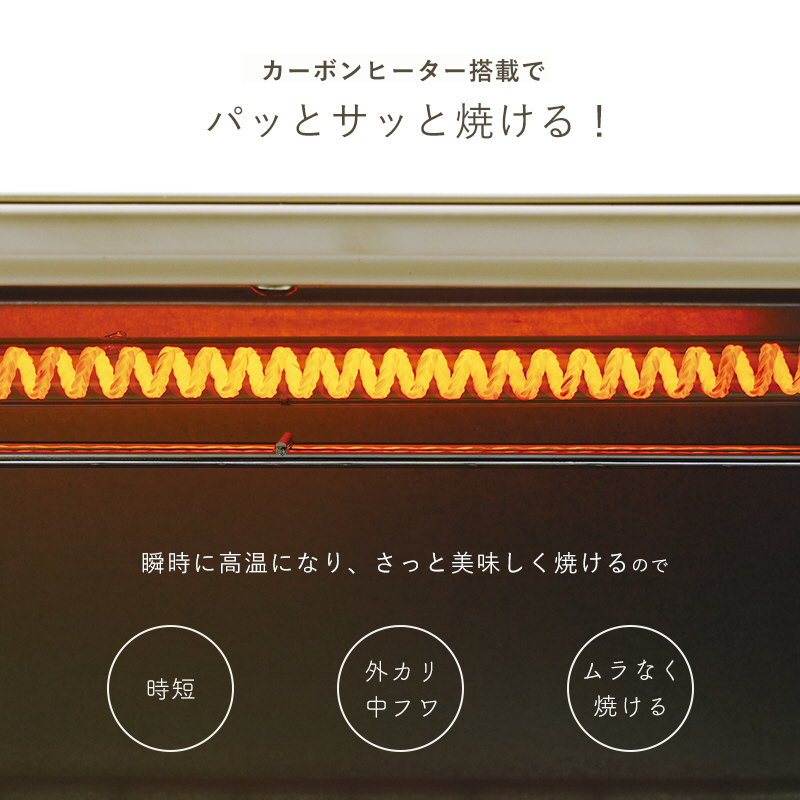 カーボンヒーター搭載で、トーストが早く美味しく焼き上がります。