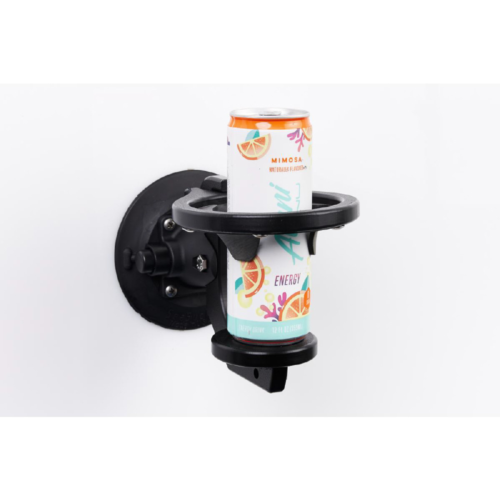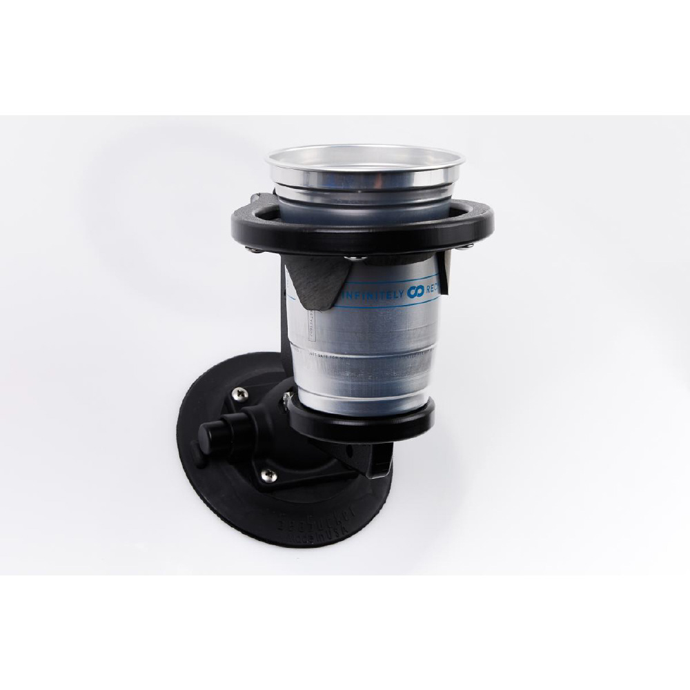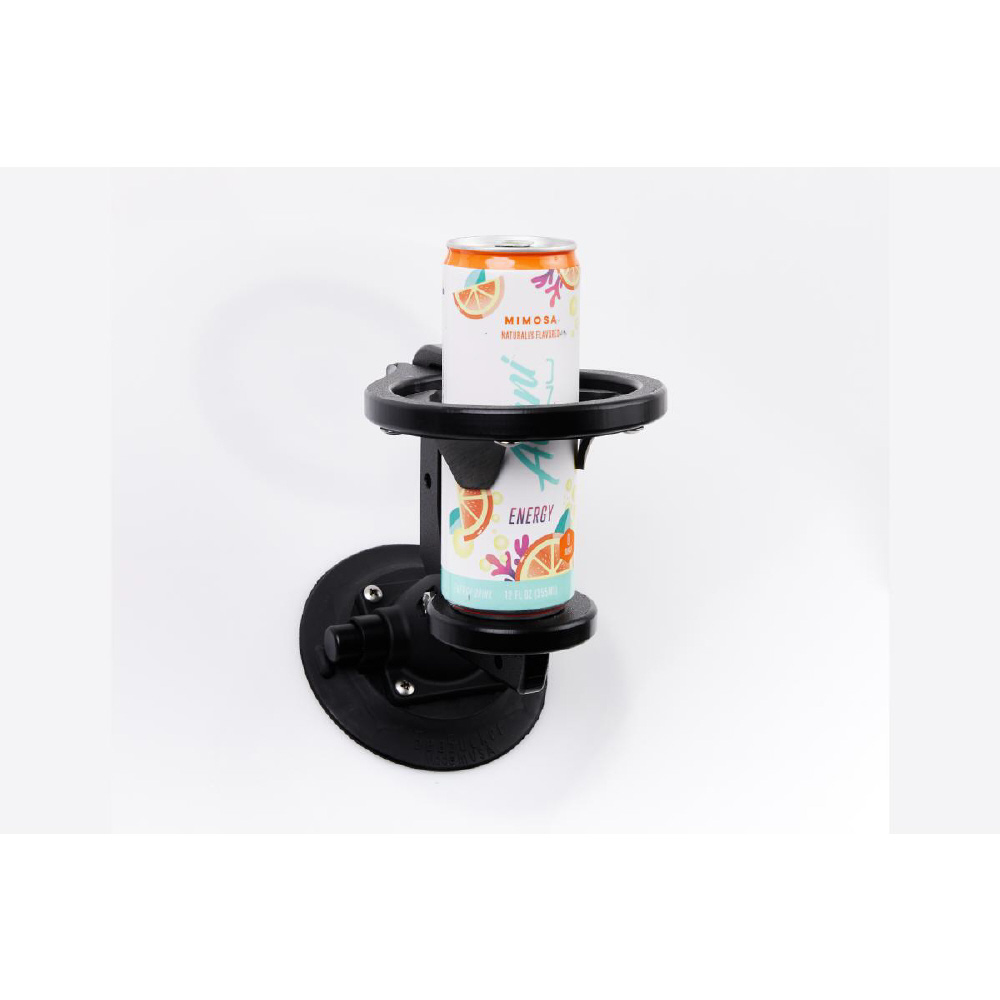 4インチの開口部にゴム製のストッパーが付いておりタンブラーやスリム缶、ペットボトルや紙コップなど様々なサイズの容器をホールドできる汎用性の高いカップホルダー。水平、垂直、斜め45度の位置に真空マウントを向けられ、面に装着が可能です。