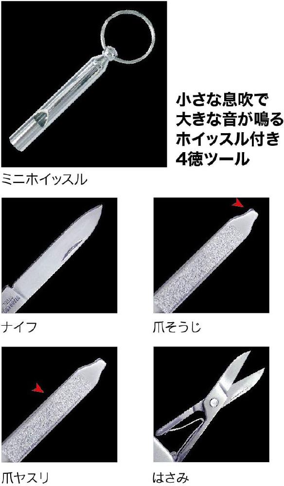 機能:ナイフ、爪ヤスリ、爪そうじ、はさみ、ミニホイッスル