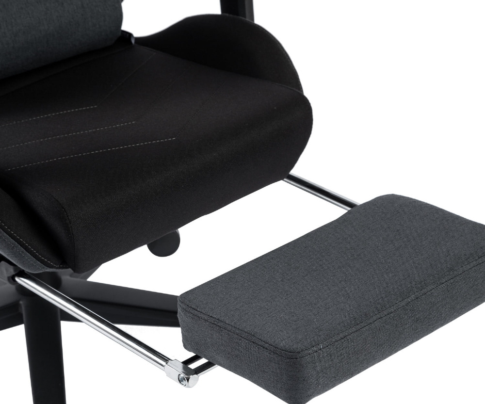 リビングに馴染むオフカラーファブリックを使用したライフスタイルゲーミングチェア(フットレスト付き)。
