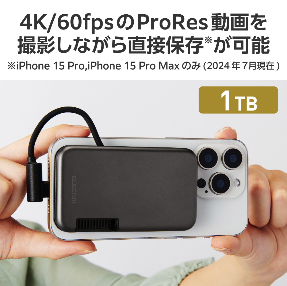 スマートフォンのデータのバックアップがもっと便利に!マグネット付き、iPhone向けケーブル一体型外付けSSDです。マグネットでiPhoneの背面に貼り付き、本製品をぶら下げた状態にならず快適な操作が可能。ケースを装着したままUSB Type-C(TM)ポートに挿し込みすぐに使用できます。